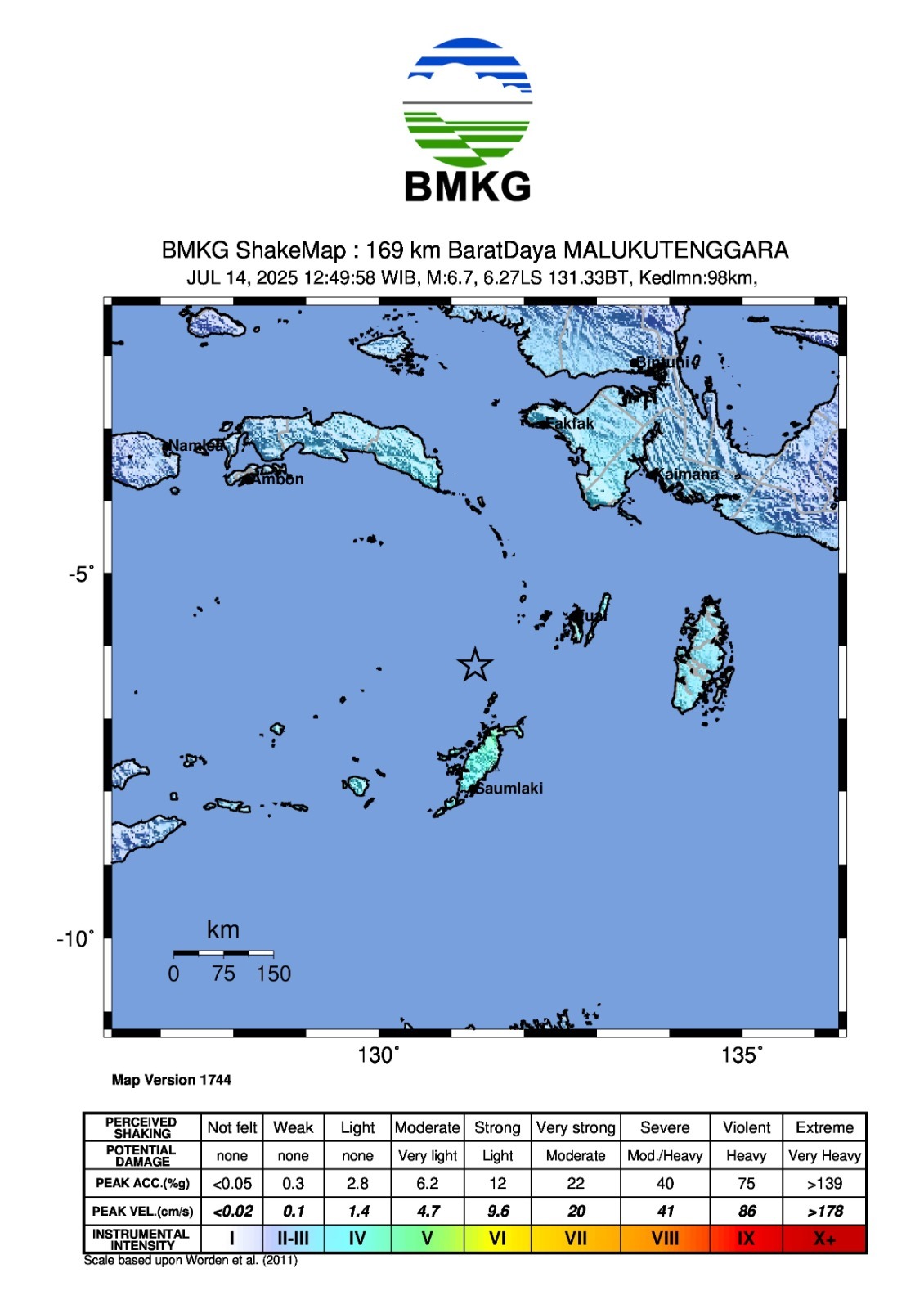 titastory, Jakarta – Gempa bumi dengan magnitudo 6,7 mengguncang wilayah laut di barat daya Kabupaten Maluku Tenggara, Senin, 14 Juli 2025. Gempa tersebut terjadi pukul 09.17 WIT dan dirasakan di beberapa wilayah di Provinsi Maluku.