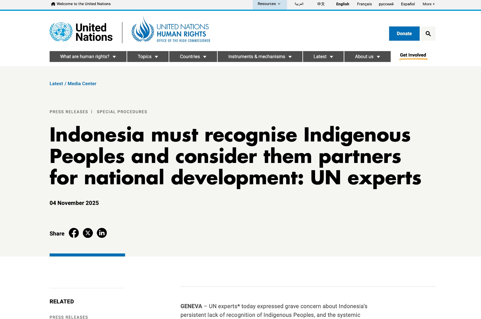 “Negara tidak akan pernah benar-benar berdaulat tanpa mengakui masyarakat adat,” tulis pernyataan PBB menegaskan.