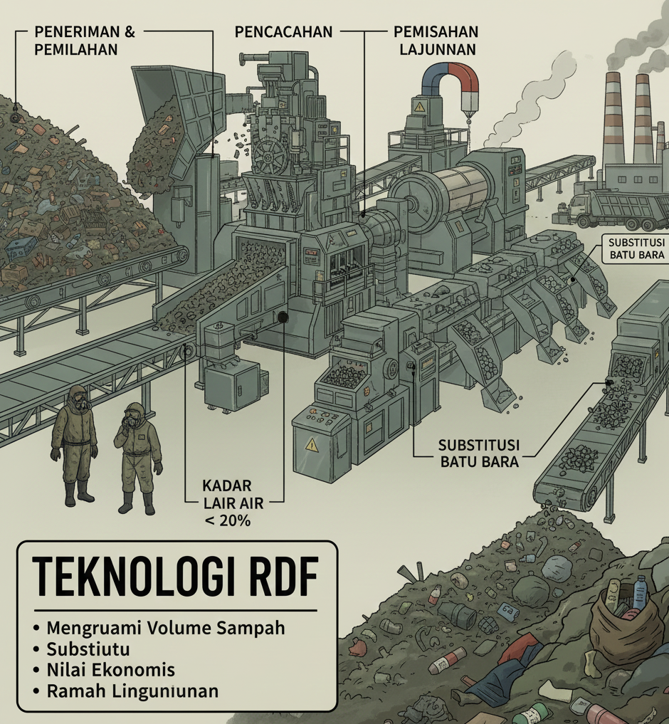 RDF bekerja dengan prinsip ekonomi sirkular. Sampah yang masuk ke fasilitas pengolahan akan dipilah, dicacah, dikeringkan, lalu dipadatkan menjadi bahan bakar alternatif berbentuk pelet. Produk ini memiliki nilai kalor tinggi dan dapat dimanfaatkan industri sebagai pengganti batu bara muda.