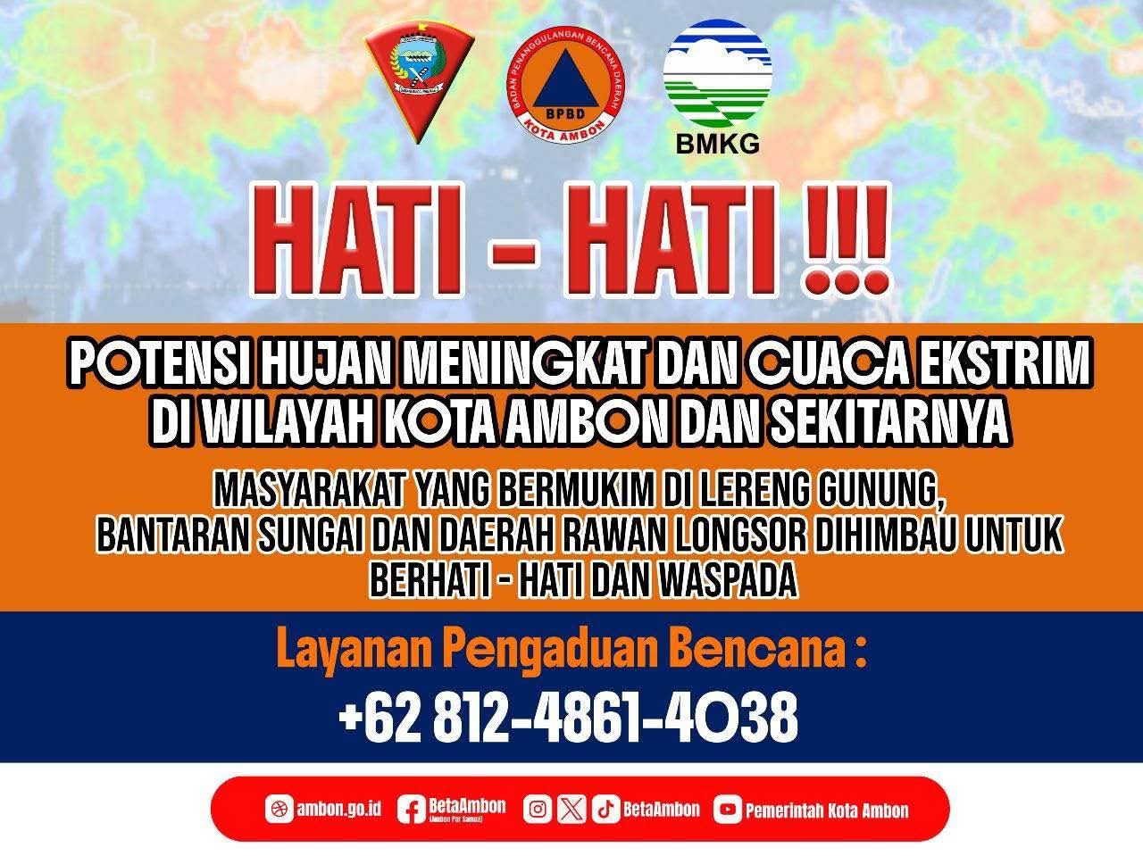 Badan Penanggulangan Bencana Daerah (BPBD) Maluku turut mengeluarkan peringatan kepada masyarakat yang bermukim di bantaran sungai untuk mengantisipasi potensi hujan deras yang masih berlanjut.