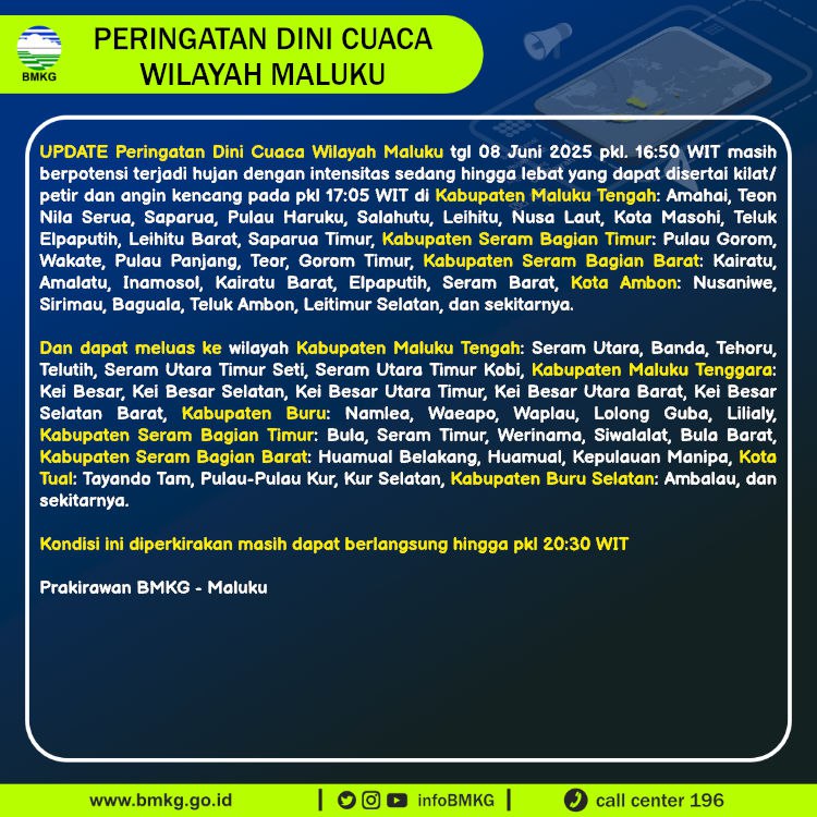 Badan Meteorologi, Klimatologi, dan Geofisika (BMKG) Stasiun Meteorologi Maluku mengeluarkan peringatan dini cuaca pada pukul 16.50 WIT, yang menyebut potensi hujan sedang hingga lebat disertai kilat, petir, dan angin kencang masih mungkin terjadi di sejumlah wilayah hingga pukul 17.05 WIT.