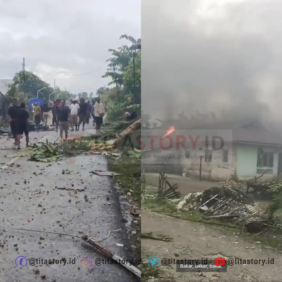 Foto suasana bentrokan pemuda di Kei, dari kiri ke kanan: massa yang berkumpul di ruas jalan utama Desa Danar, Kecamatan Kei Kecil Timur Selatan; serta kondisi salah satu rumah yang dibakar oleh massa. Sumber Foto: Akun Facebook @Wulan Muchlis Wear/titastory