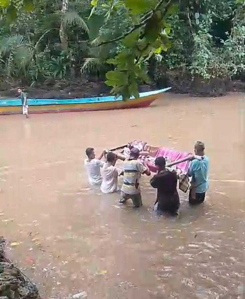 Perjalanan yang harus ditempuh bukan perjalanan singkat. Jarak sekitar 15 kilometer dilalui dengan berjalan kaki selama lima hingga enam jam. Puluhan warga bergantian memikul dan membopong pasien, menyeberangi sungai, mendaki bukit terjal, dan menyusuri pantai. Ketika laut bergelombang dan jalur laut tak memungkinkan dilalui, jalur darat—yang sebenarnya belum pernah ada menjadi satu-satunya harapan.
