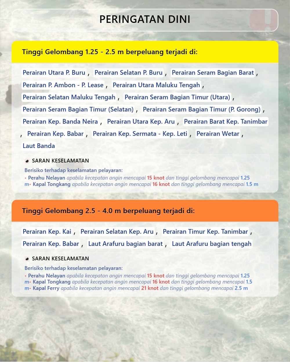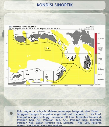 “Peringatan dini ini berdasarkan pola angin terkini, di mana kecepatan tertinggi terpantau bisa menembus 30 knot,” ujar Anernç Wulan S., staf prakirawan BMKG Stasiun Ambon, Jumat, 1 Agustus 2025.
