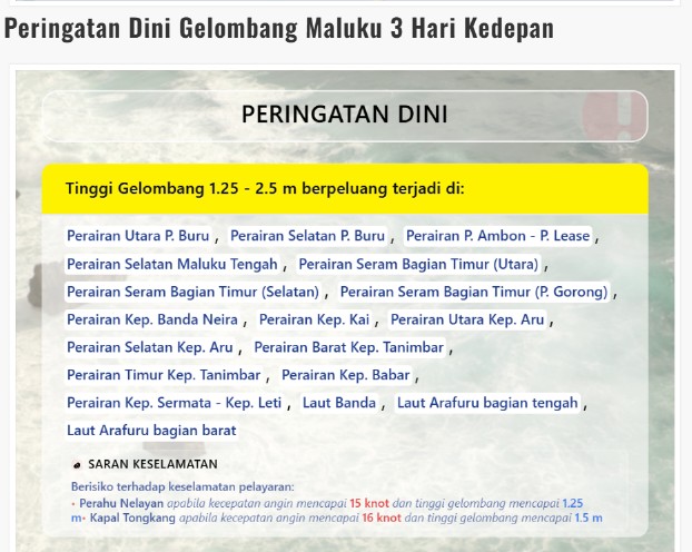 “Kondisi berbahaya juga diprediksi terjadi di Laut Banda, Perairan Kepulauan Babar, Perairan Selatan Maluku Tengah, dan sebagian wilayah Laut Arafura,” tambah Kakiailatu.
