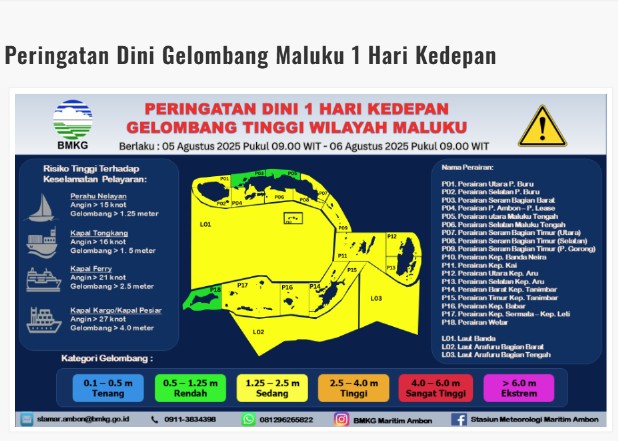 titastory, Ambon – Badan Meteorologi, Klimatologi, dan Geofisika (BMKG) Stasiun Ambon mengeluarkan peringatan dini terkait kondisi cuaca ekstrem di sejumlah wilayah perairan Maluku. Berdasarkan analisis sinoptik periode 5–8 Agustus 2025, kecepatan angin terpantau mencapai 30 knot dan tinggi gelombang hingga 2,5 meter.