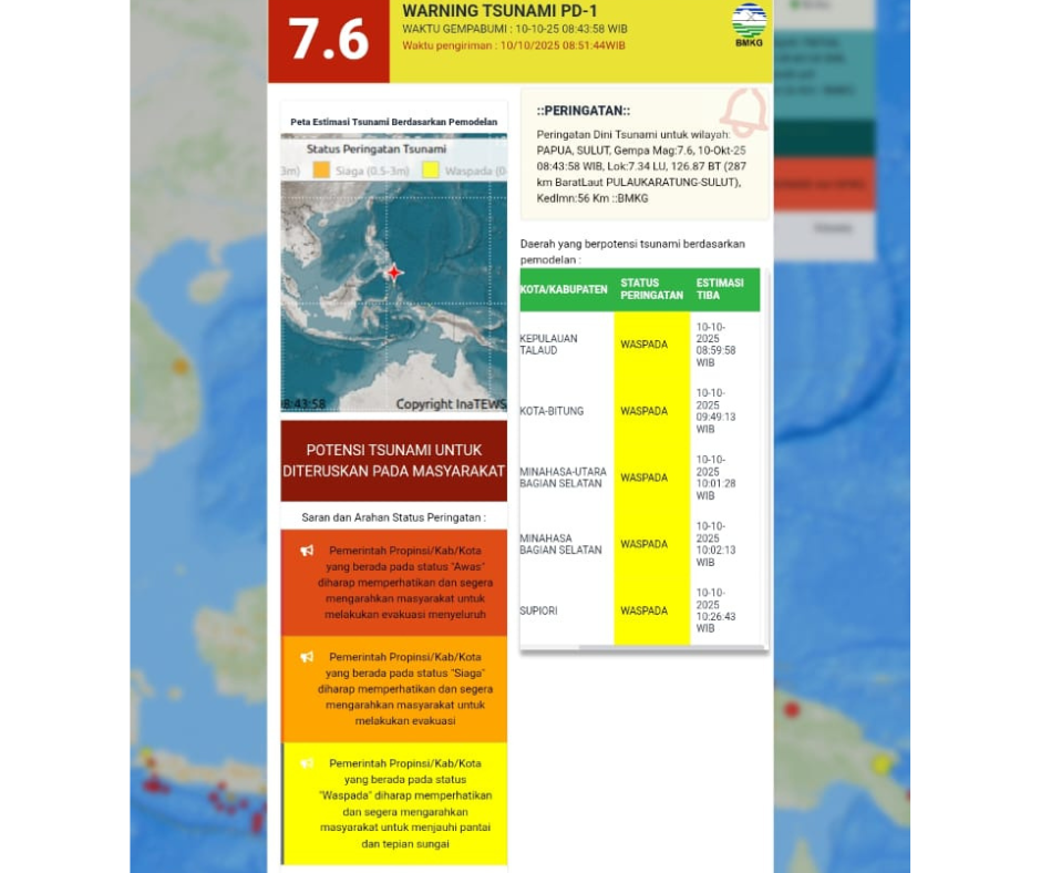 Berdasarkan hasil pemodelan, gempa ini berpotensi memicu tsunami. BMKG menetapkan status waspada untuk lima wilayah di Indonesia: