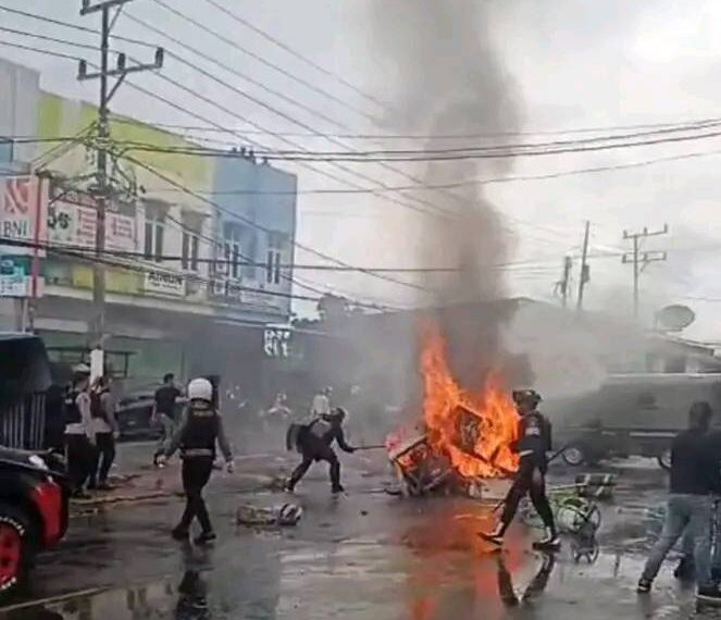 Keterangan gambar: Massa yang marah akibat penembakan gas air mata dan tembakan peluru, mengamuk dan membakar sejumlah fasilitas di ruas jalan utama. Foto: Akun Facebook @Varra Iyaba