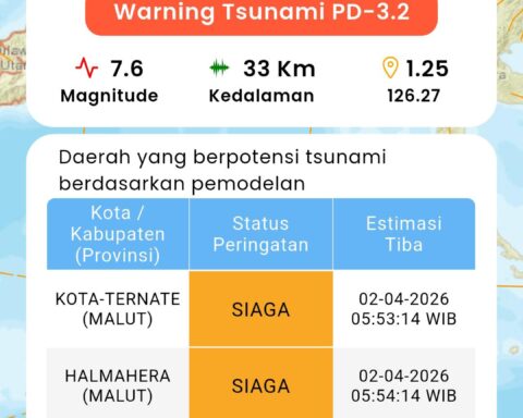 Bitung, Sulut,— Gempa bumi tektonik berkekuatan Magnitudo 7,6 mengguncang wilayah laut tenggara Kota Bitung, Sulawesi Utara, Kamis pagi, 2 April 2026, pukul 05.48 WIB.