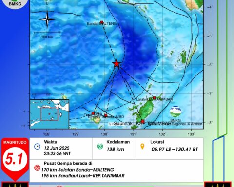 titastory, Maluku Tengah — Gempabumi tektonik berkekuatan M5,1 mengguncang wilayah Laut Banda, Maluku Tengah, Maluku, pada Kamis malam, 12 Juni 2025 pukul 23.23 WIT. Badan