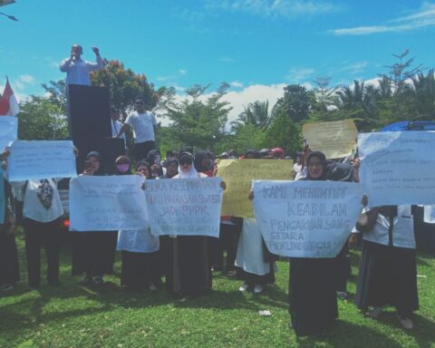 titastory,Seram Bagian Barat –Puluhan tenaga honorer dari sekolah swasta di Kabupaten Seram Bagian Barat (SBB) menggelar aksi demonstrasi di depan Kantor Kementerian Agama (Kemenag)
