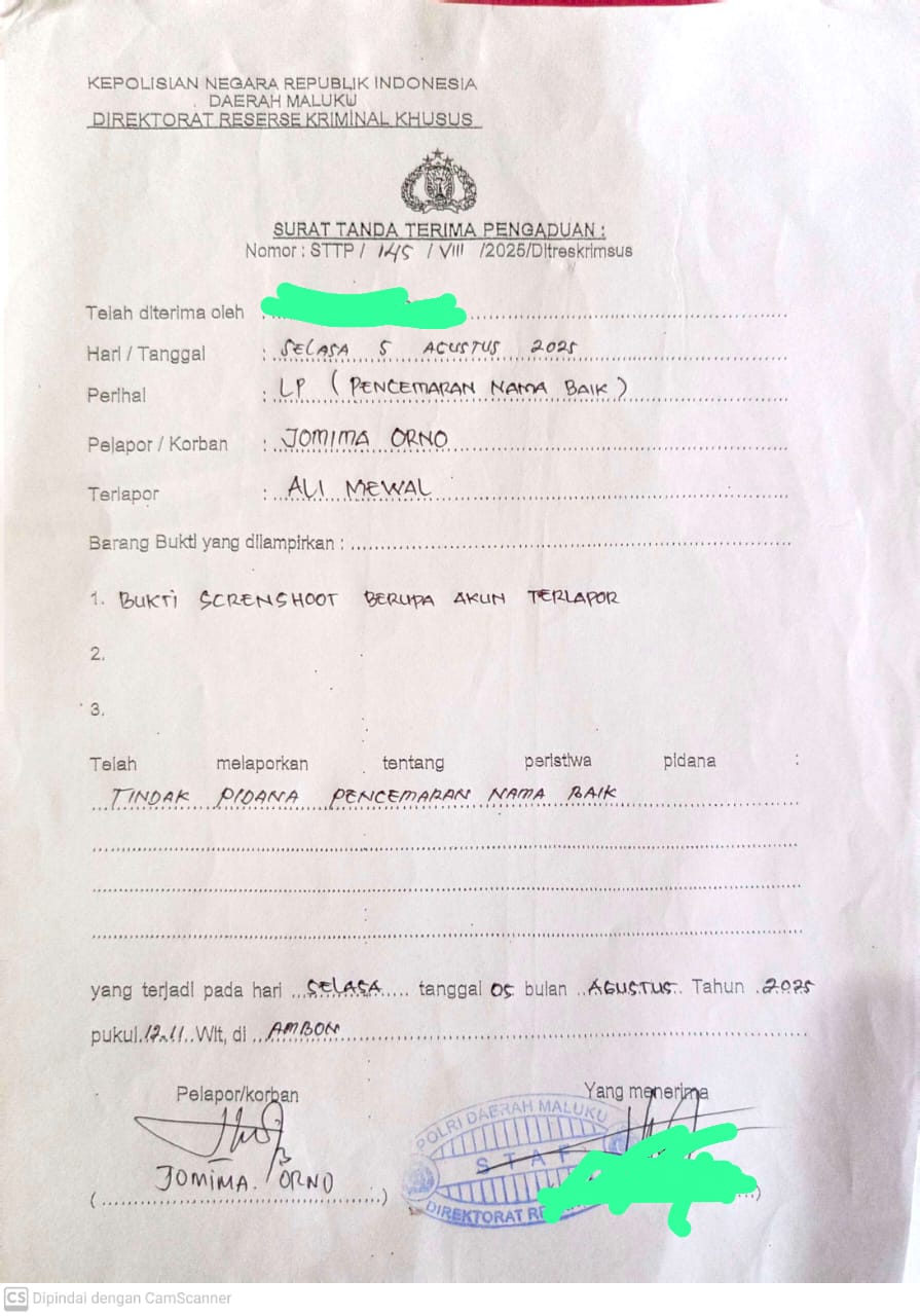 titastory, Ambon – Akun media sosial Facebook bernama @Ali_Mewal resmi dilaporkan ke Polda Maluku atas dugaan penyebaran fitnah dan pencemaran nama baik terhadap Jomima Orno, seorang perempuan asal Maluku. Laporan tersebut dilayangkan setelah akun tersebut mempublikasikan tuduhan yang dinilai mengandung unsur penghinaan dan kebohongan, termasuk menyertakan foto pribadi korban.