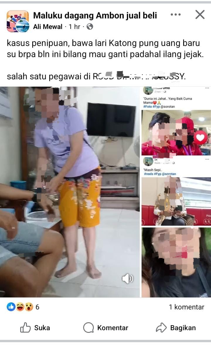 Dalam unggahan di grup Facebook Maluku Dagang Ambon Jual-Beli, akun @Ali_Mewal menulis bahwa Jomima Orno adalah pegawai RSUD Haulussy yang membawa kabur uang dan tidak memenuhi janji pembayaran utang. Postingan itu juga disertai dengan foto-foto pribadi korban.