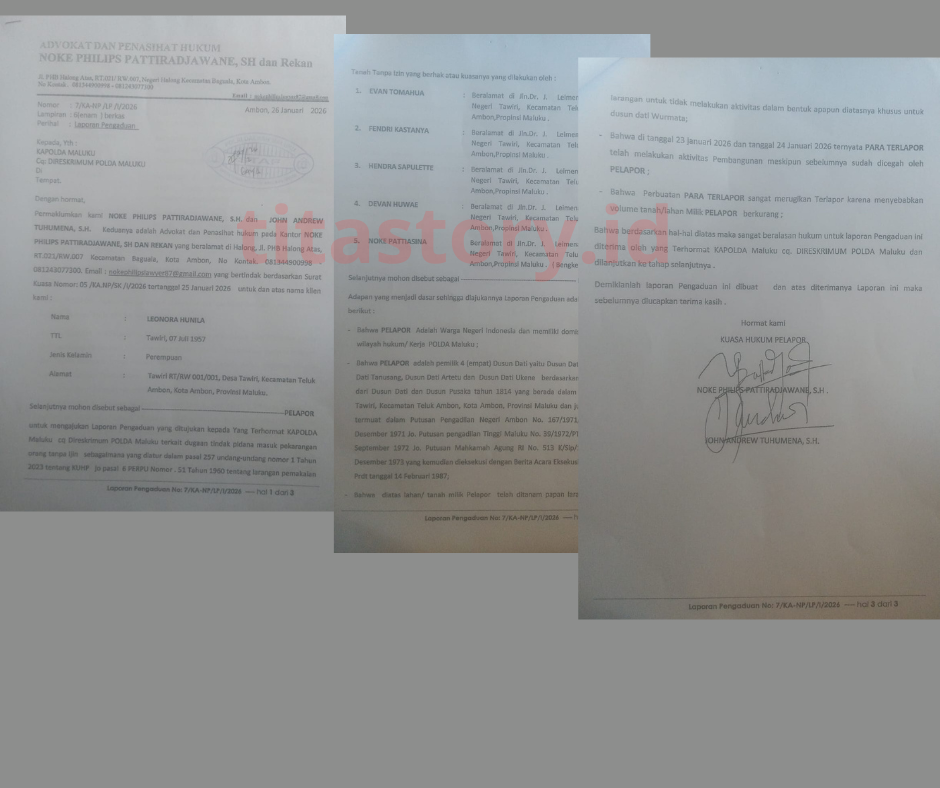 Ambon — Konflik agraria di Negeri Tawiri, Kecamatan Teluk Ambon, kembali memanas. Lima orang warga berinisial ET, FK, HS, DH, dan NP resmi dilaporkan ke Polda Maluku atas dugaan penyerobotan lahan dan aktivitas pembangunan tanpa izin yang sah. Laporan tersebut masuk ke Direktorat Reserse Kriminal Umum (Ditreskrimum) pada Senin (26/1/2026).