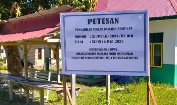 titastory, Ambon – Tindakan Kepala Desa Waesala, Kecamatan Huamual Belakang, Kabupaten Seram Bagian Barat, Maluku, kembali memantik polemik. Usai putusan Pengadilan Negeri Dataran Hunipopu Nomor: 21/Pdt.G/2024/PN.Drh, sang kepala desa diduga menyebarkan informasi keliru terkait kepemilikan wilayah adat Negeri Waesala melalui spanduk dan selebaran yang dibagikan ke sejumlah dusun.