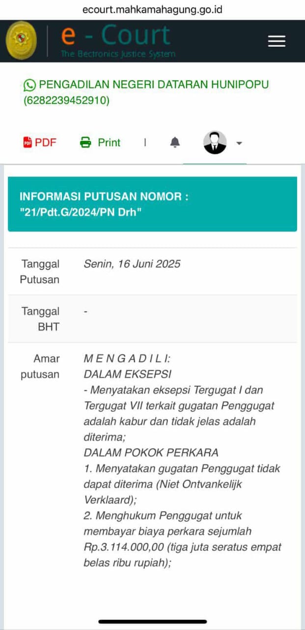 Informasi putusan PN Dataran Honipopu. Foto: Ist