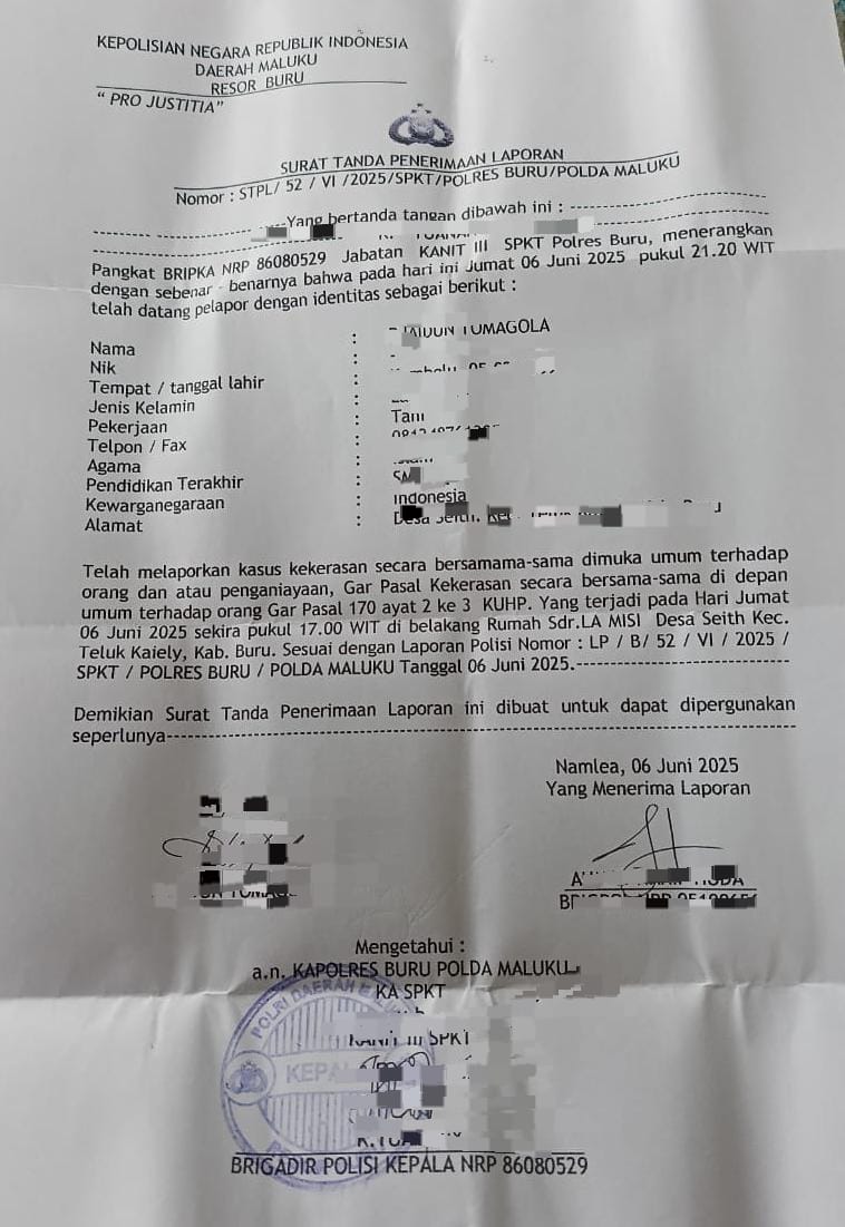 Peristiwa yang terjadi sekitar pukul 17.00 WIT itu telah dilaporkan secara resmi ke Mapolres Buru oleh pihak keluarga, sebagaimana tercantum dalam Laporan Polisi Nomor: LP/B/52/VI/SPKT/POLRES BURU/POLDA MALUKU, tertanggal 6 Juni 2025. Para terduga pelaku dikenai pasal 170 ayat 2 ke-3 Kitab Undang-Undang Hukum Pidana (KUHP) tentang tindak kekerasan secara bersama-sama yang mengakibatkan korban meninggal dunia.