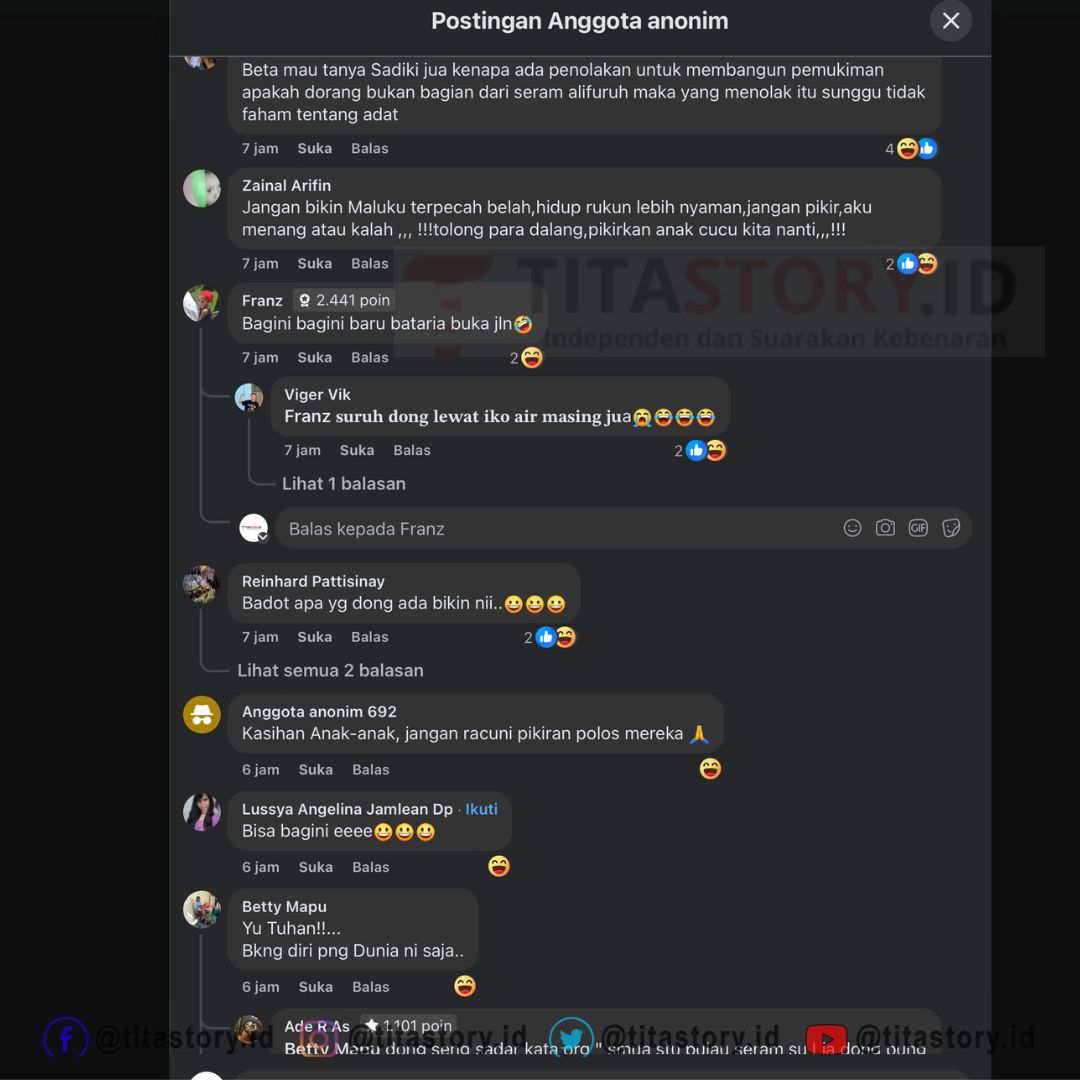 “Pembangunan rumah warga pasca konflik bisa-bisanya ada aksi penolakan? Apa motifnya? Serius nanya,” tulis Iwan, sembari menandai sejumlah pejabat seperti Abdullah Vanath, Hendrik Lewerissa, hingga anggota DPR-RI dan DPRD Maluku Tengah.