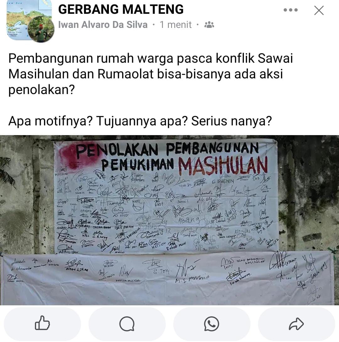 Unggahan tersebut pertama kali muncul di grup Facebook Gerbang Malteng oleh akun bernama @Iwan Alvaro Da Silva. Ia mempertanyakan motif penolakan pembangunan rumah warga Masihulan pasca-konflik yang melibatkan Negeri Sawai dan Rumaolat, serta menyinggung keterlibatan tokoh-tokoh daerah.