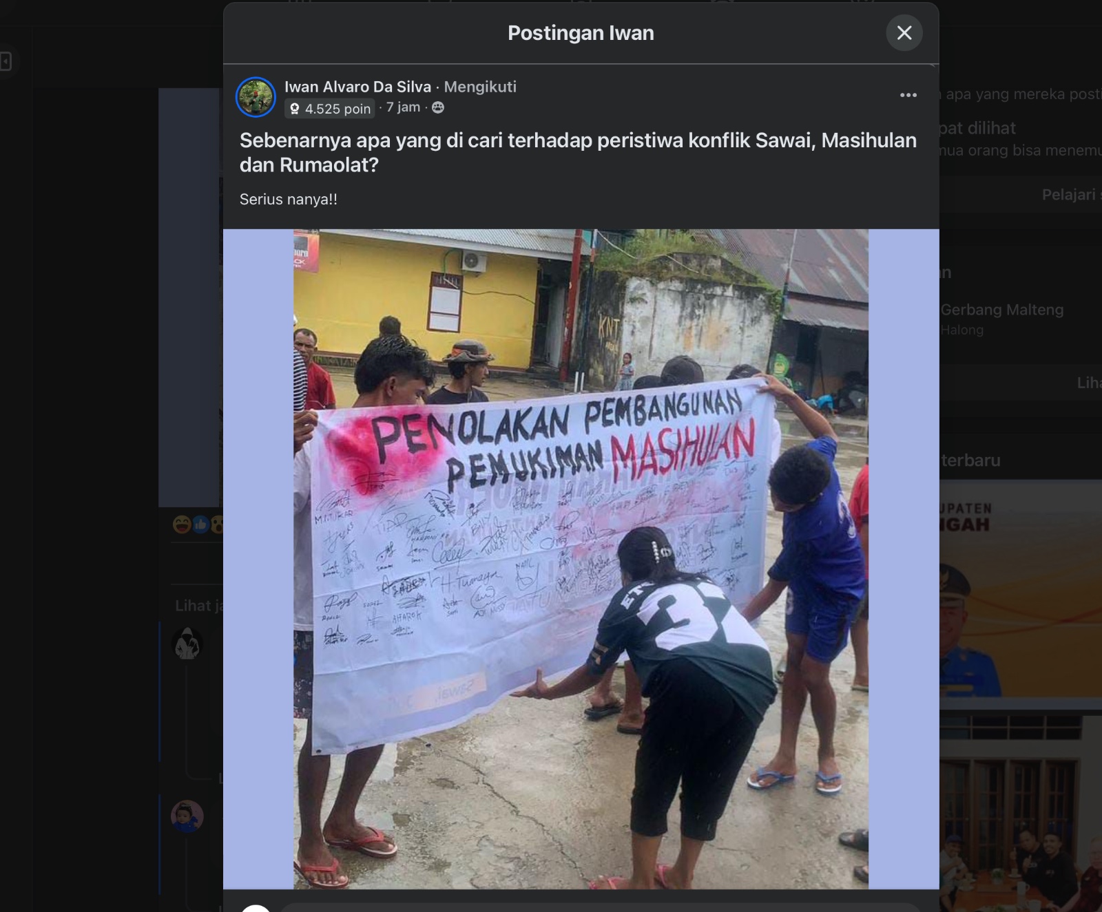 Unggahan tersebut pertama kali muncul di grup Facebook Gerbang Malteng oleh akun bernama @Iwan Alvaro Da Silva. Ia mempertanyakan motif penolakan pembangunan rumah warga Masihulan pasca-konflik yang melibatkan Negeri Sawai dan Rumaolat, serta menyinggung keterlibatan tokoh-tokoh daerah.