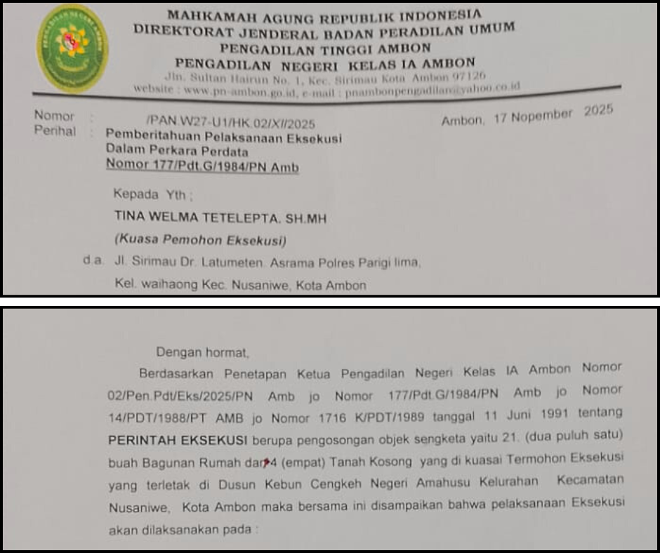 Ambon, — Proses eksekusi lahan di kawasan kebun cengkih Amahusu, Kota Ambon, kembali menuai polemik setelah mengalami penundaan hingga tiga kali berturut-turut. Eksekusi yang melibatkan 12 unit rumah ini dilaporkan tertunda tanpa alasan yang dinilai jelas dan logis, sehingga memicu dugaan intervensi serta konflik kepentingan di tubuh Polresta Ambon.