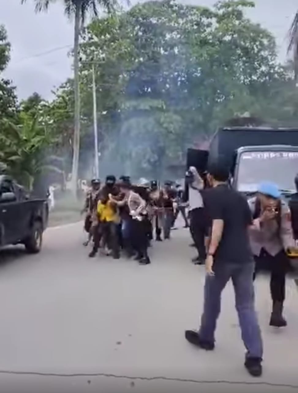 Kericuhan pecah. Massa melempari aparat dengan batu dan botol, sementara polisi membalas dengan tembakan gas air mata untuk membubarkan massa.