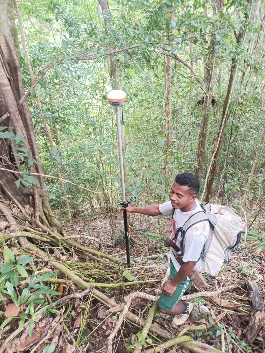 Caption: Salah satu petugas pengukuran dan pemetaan lahan untuk kepentingan PLTM oleh mitra PT PLN Pusharlis di Makariki, Negeri Yaputih, Kecamatan Tehoru, Foto: Ist