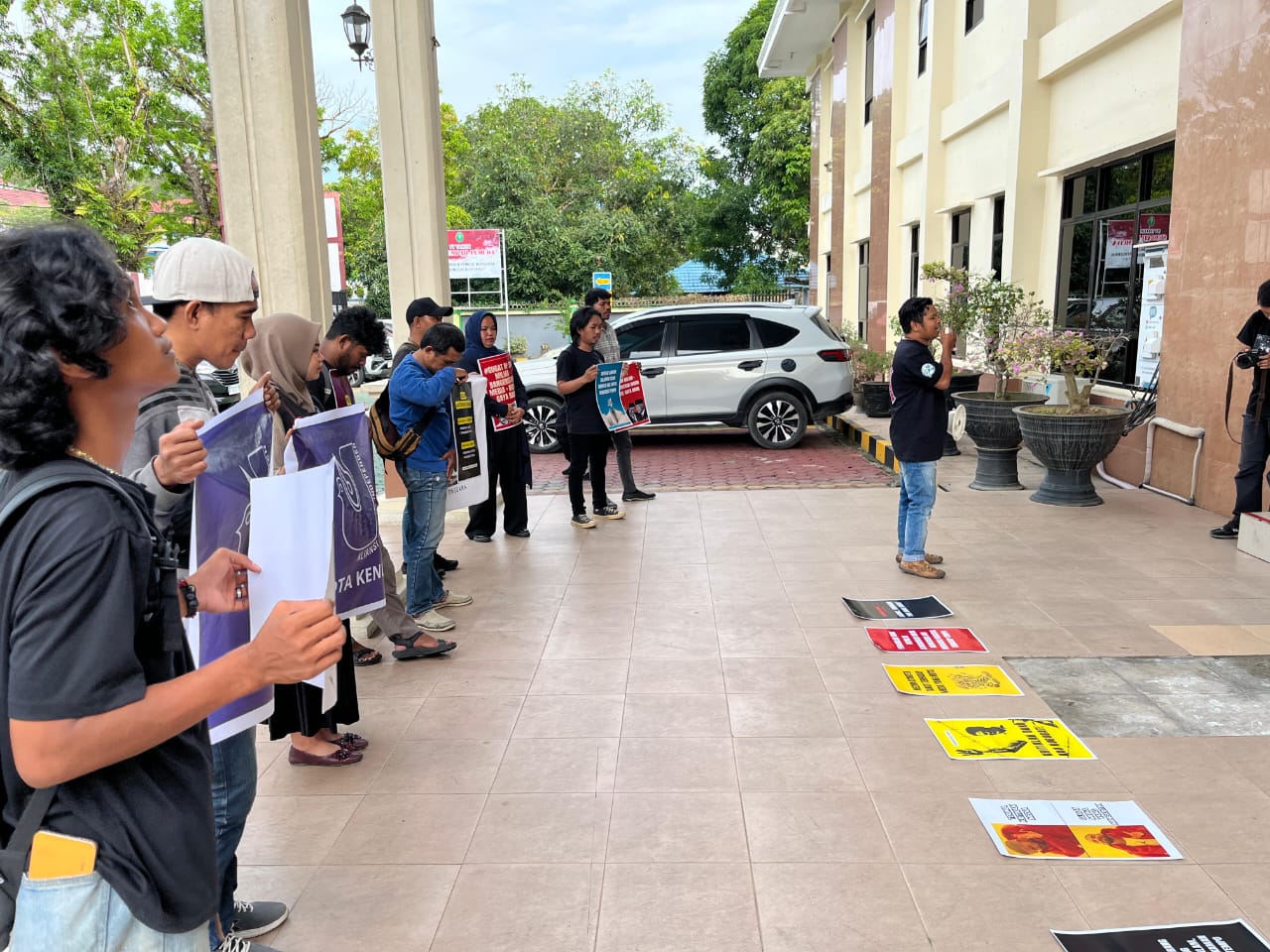 Di Kendari, Aliansi Jurnalis Independen (AJI) Kendari, Komite Keselamatan Jurnalis (KKJ) Sultra, IJTI Sultra, dan LPM IAIN Kendari berunjuk rasa di depan Pengadilan Negeri Kendari, Kamis (6/11/2025).