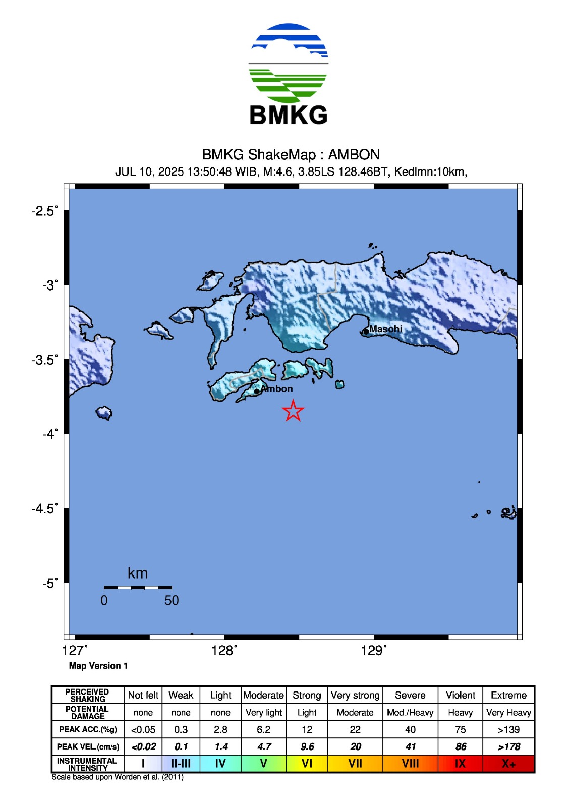 “Dengan lokasi episenter dan kedalaman hiposenter tersebut, guncangan dirasakan di wilayah Ambon dalam skala III MMI dan di wilayah Amalatu, Seram Bagian Barat, sekitar II MMI,” jelas Kuncoro.