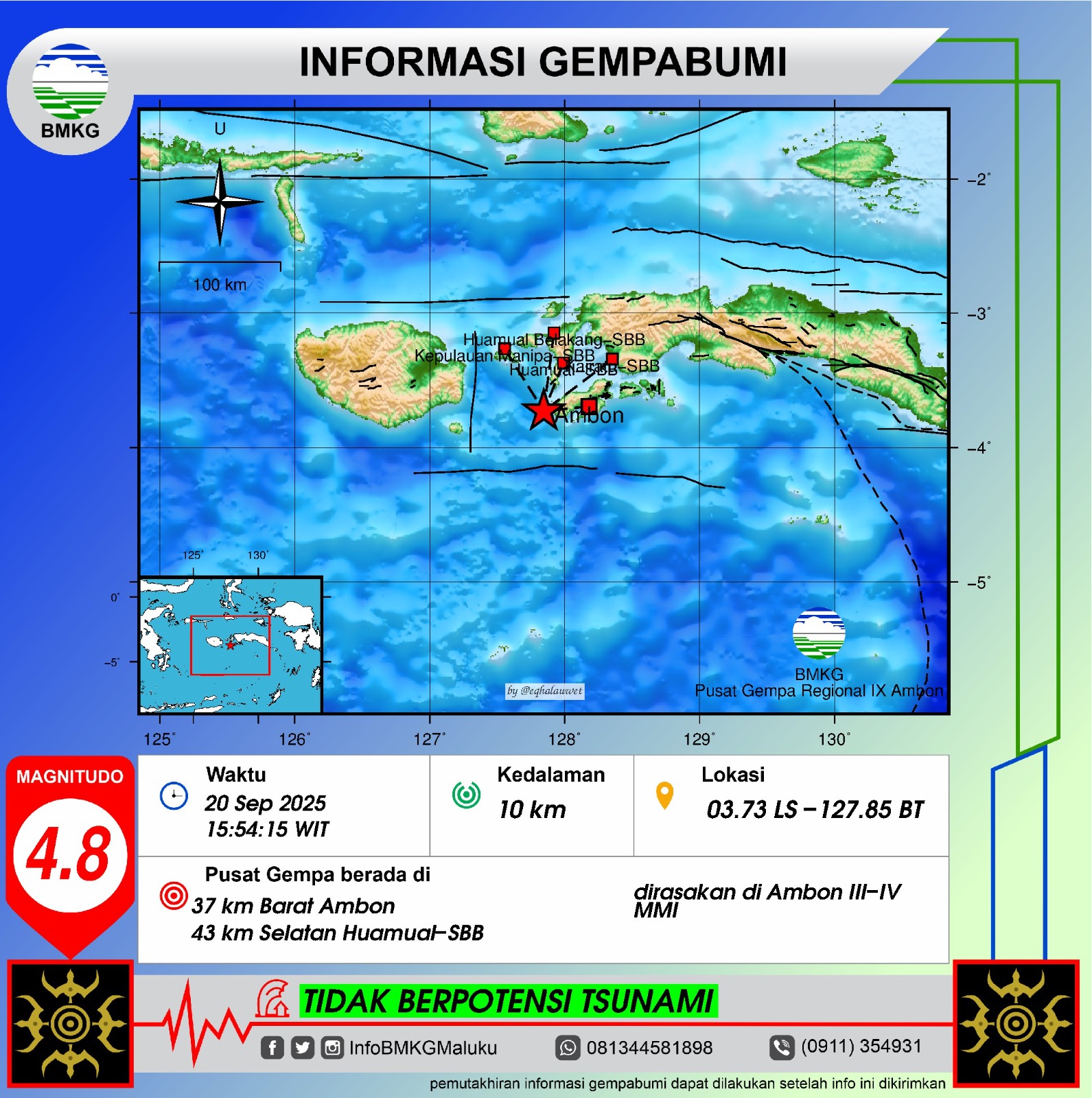 titastory, Ambon – Gempa bumi dengan magnitudo 4,8 mengguncang Pulau Seram, Maluku, pada Sabtu (20/9/2025) pukul 15.54 WIT.