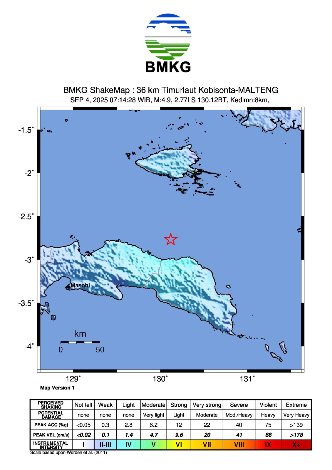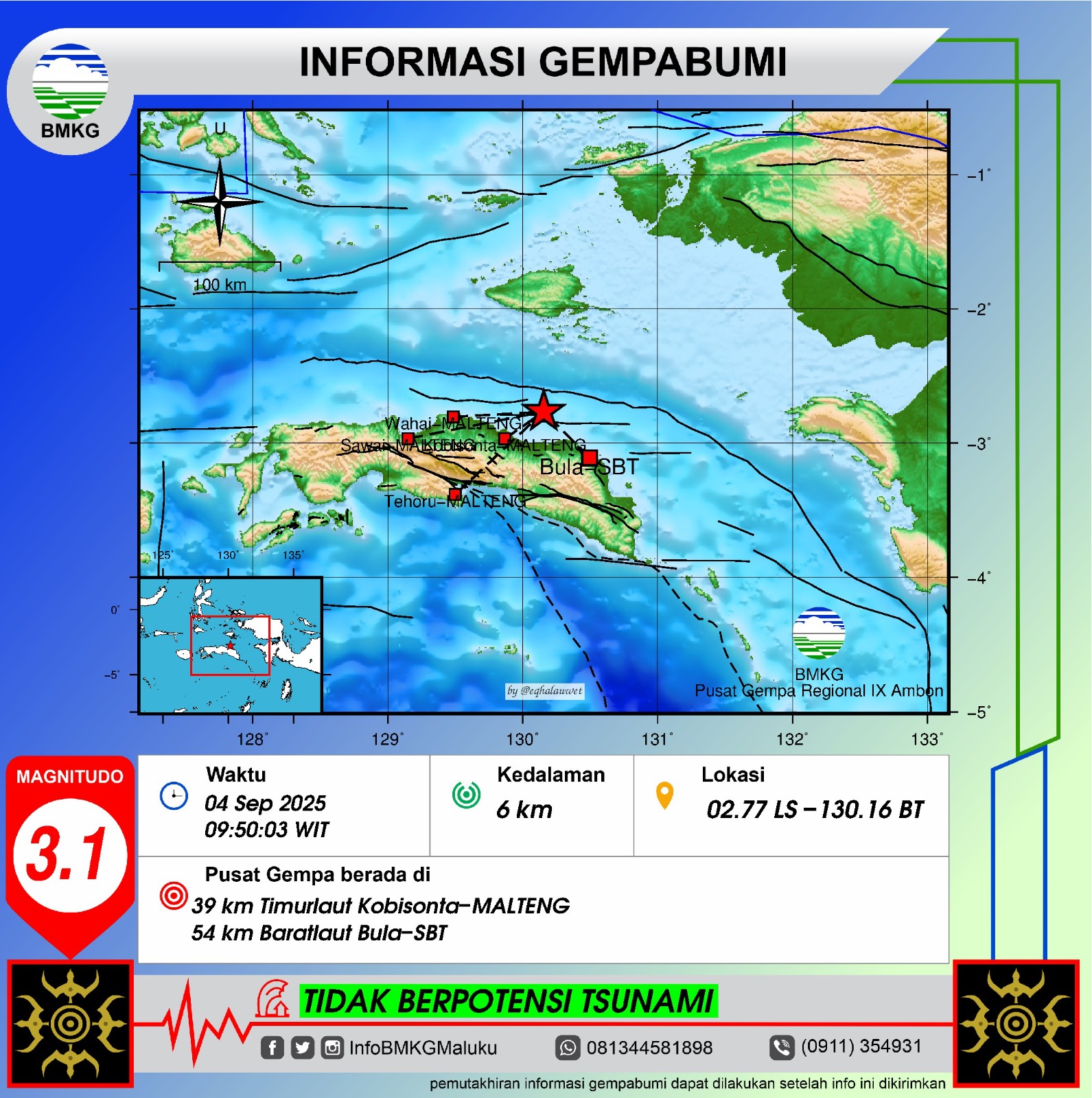 titastory, Maluku Tengah – Gempa bumi tektonik berkekuatan magnitudo 4,9 mengguncang wilayah Kobisonta, Kecamatan Seram Utara Timur Seti, Kabupaten Maluku Tengah, Selasa malam, 2 September 2025. Getaran dirasakan nyata warga di dalam rumah, namun Badan Meteorologi, Klimatologi, dan Geofisika (BMKG) memastikan gempa tersebut tidak berpotensi tsunami.