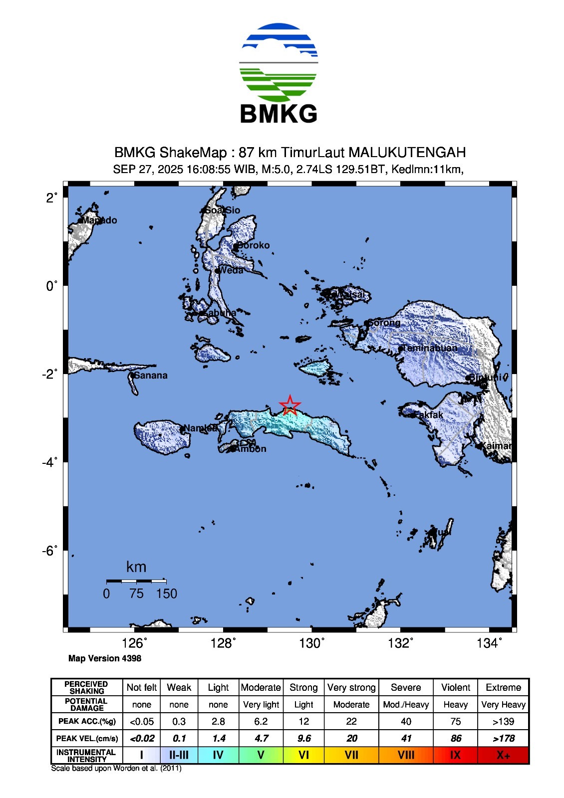 titastory, Maluku Tengah – Gempa tektonik dengan magnitudo 5,0 mengguncang wilayah Pantai Timur Laut Maluku Tengah, Maluku, pada Sabtu, 27 September 2025, pukul 18.08 WIB. Badan Meteorologi, Klimatologi, dan Geofisika (BMKG) memastikan gempa tersebut tidak memicu tsunami.