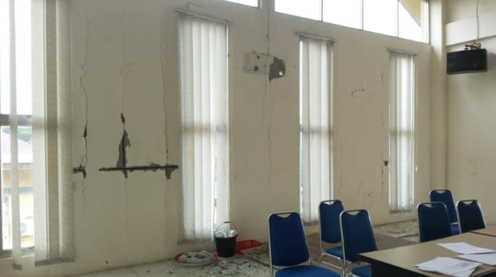 Selain korban luka, gempa turut menimbulkan kerusakan cukup masif pada fasilitas publik dan rumah warga. Beberapa bangunan dilaporkan roboh, sementara sebuah gudang penyimpanan minyak tanah terbakar usai guncangan utama.