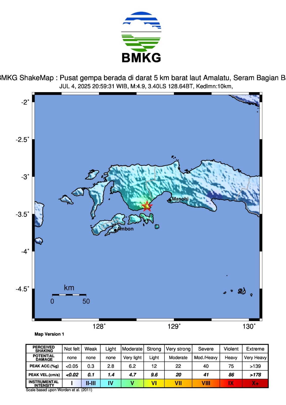 titastory, Ambon – Gempa bumi tektonik bermagnitudo 4,9 mengguncang wilayah Kecamatan Amalatu, Kabupaten Seram Bagian Barat (SBB), Jumat malam, 4 Juli 2025. Guncangan dangkal yang terjadi pada pukul 23.50 WIT itu menyebabkan kepanikan warga, khususnya di kawasan Kairatu, Masohi, Pulau Ambon, dan Pulau Saparua. Sejumlah warga bahkan dilaporkan mengungsi ke lokasi aman.