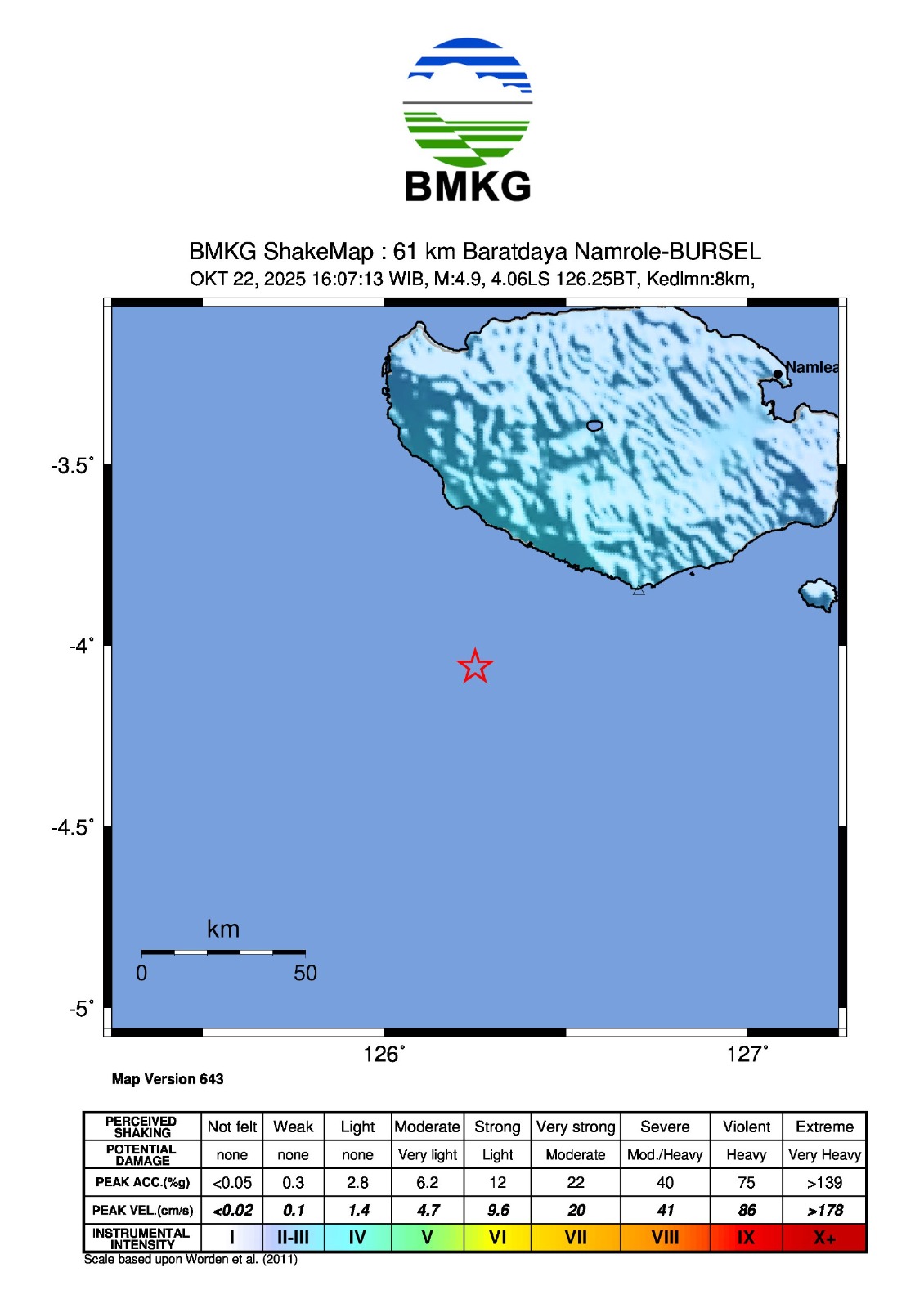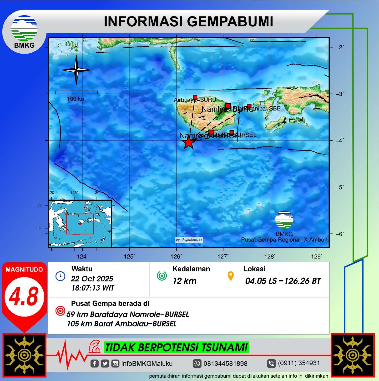 Ambon, — Gempa bumi tektonik berkekuatan magnitudo 4,9 mengguncang wilayah Leksula, Kabupaten Buru Selatan, Maluku, pada Rabu, 22 Oktober 2025, pukul 18.07 WIT. Menurut hasil analisis Badan Meteorologi, Klimatologi, dan Geofisika (BMKG) Stasiun Geofisika Ambon, episenter gempa terletak di laut pada koordinat 4,06 Lintang Selatan dan 126,25 Bujur Timur, atau sekitar 61 kilometer barat daya Namrole, dengan kedalaman 8 kilometer.