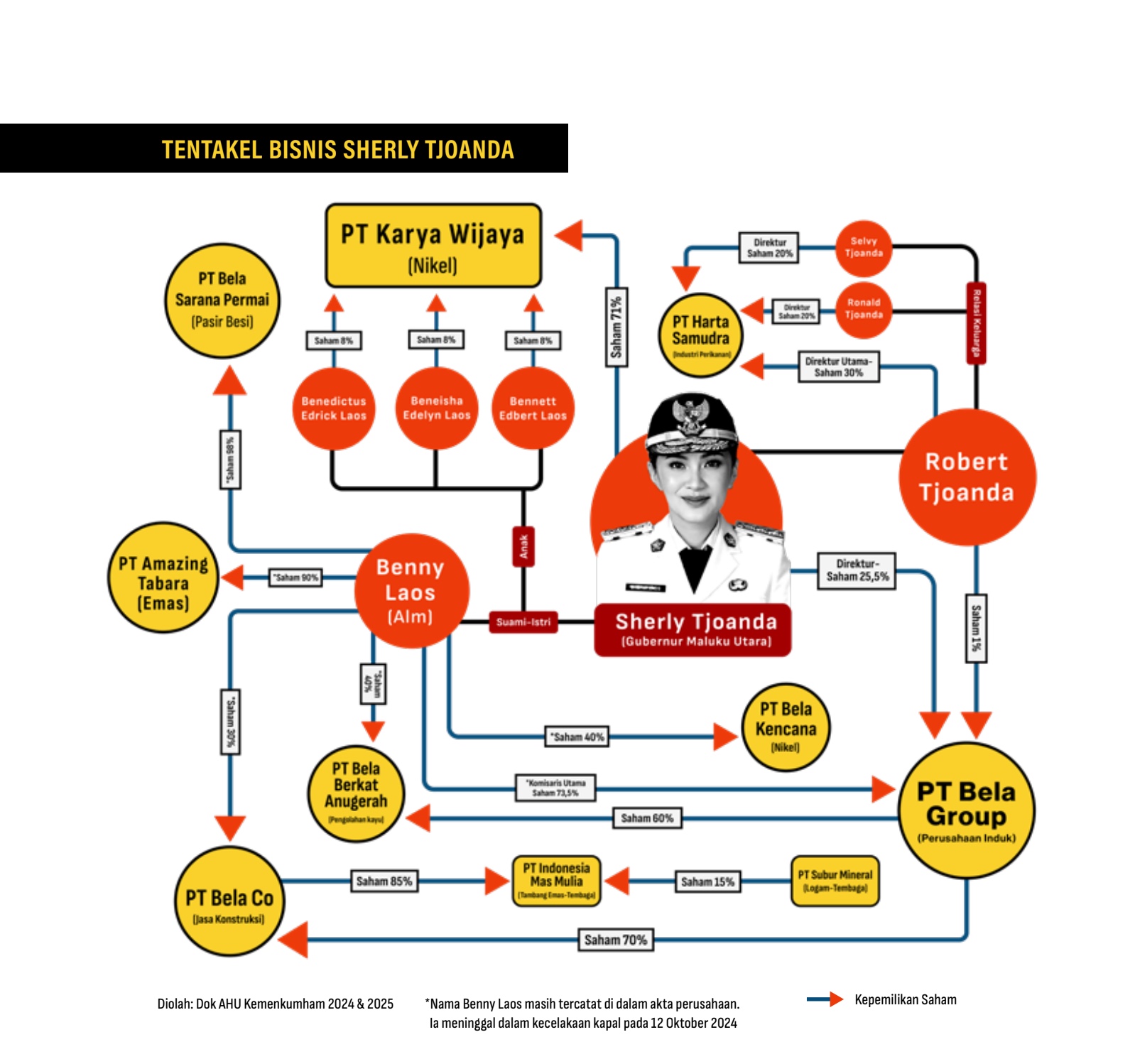 Tak berhenti di situ, Sherly juga tercatat sebagai direktur dan pemegang saham 25,5 persen di PT Bela Group, induk yang menaungi berbagai perusahaan keluarga. Dari konstruksi hingga perdagangan bahan tambang, semua terhubung lewat struktur korporasi yang berlapis-lapis.