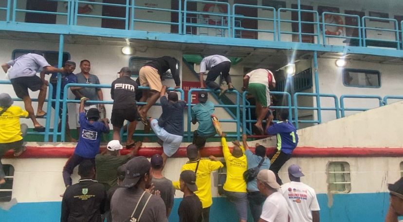 Suasana di pelabuhan sempat diwarnai antrean panjang ketika kapal mulai merapat. Bahkan sebelum kapal bersandar sempurna, sejumlah penumpang terlihat berusaha naik lebih dulu melalui lambung kapal.