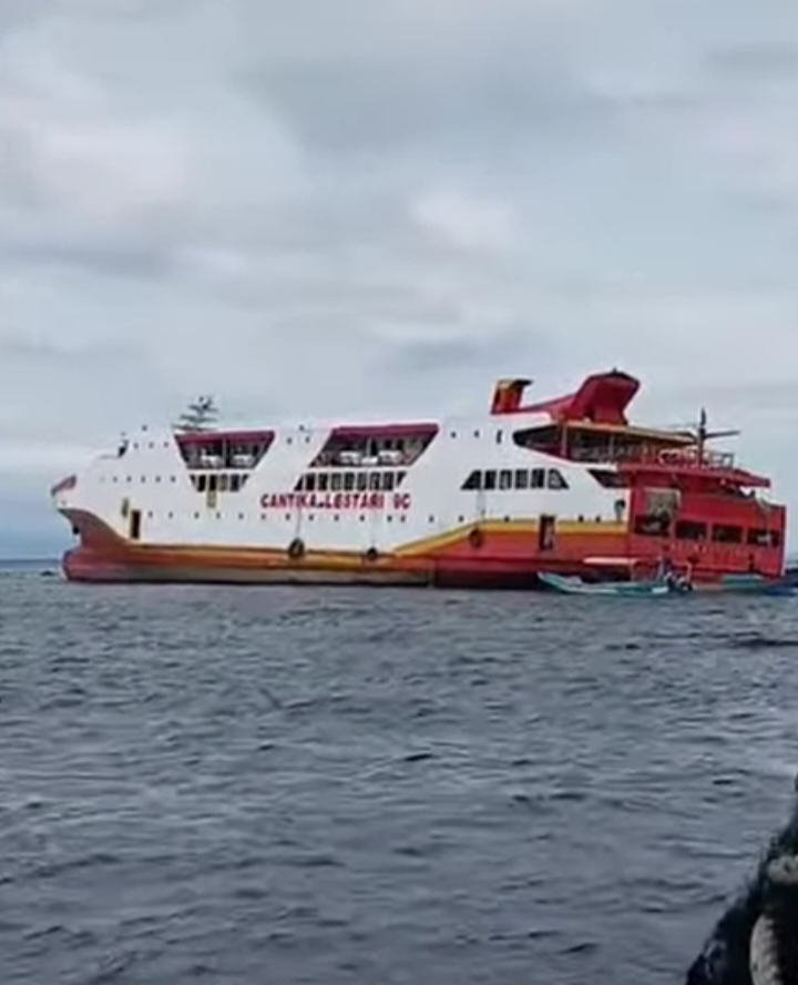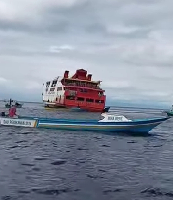 Keterangan gambar: Kapal penumpang Cantika Lestari 9C sementara kandas setelah menabrak karang di perairan Laut Weda, Halmahera Tengah, Maluku Utara, Kamis pagi. Foto: Ist (11/12/2025).