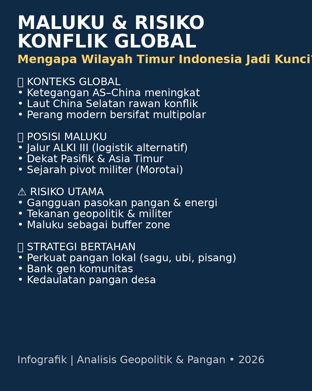 Caption: Infografik Analisis Geopolitik & Pangan, dalam hal ini Maluku berisiko konflik global. Kredit: Diolah AI
