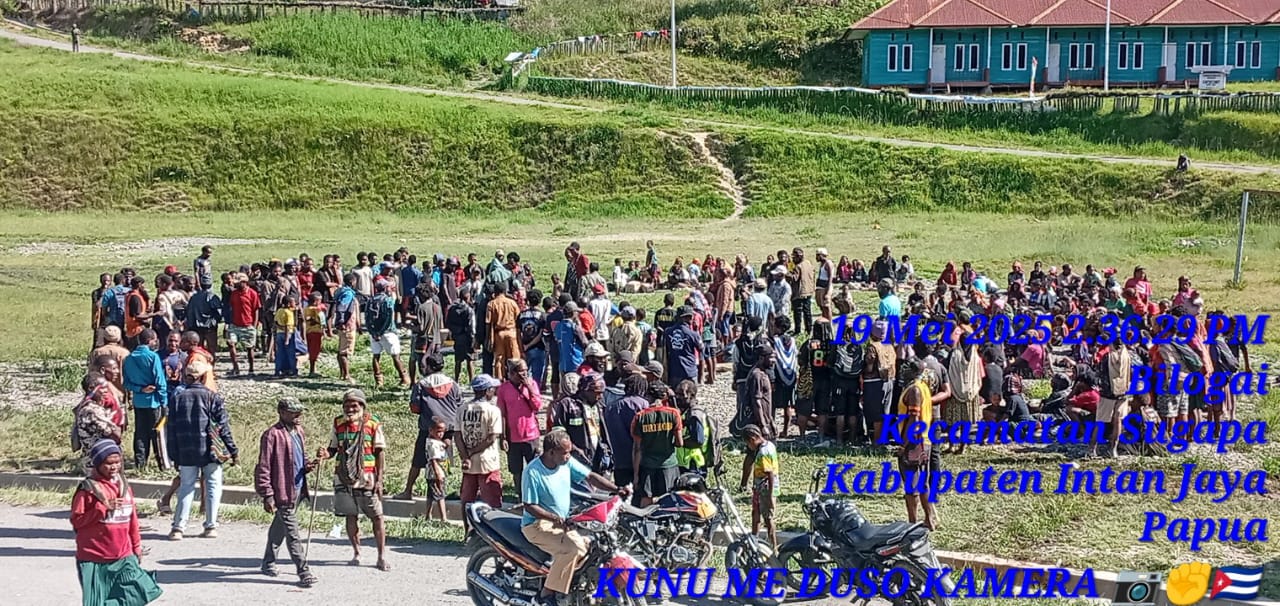 titastory, Intan Jaya – Ratusan warga sipil dari berbagai kampung di Kabupaten Intan Jaya memadati lapangan sepak bola Yokatapa, Distrik Sugapa, pada Senin 19 Mei 2025, sekitar pukul 09.36.