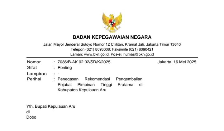 titastory, Kepulauan Aru – Badan Kepegawaian Negara (BKN) menangguhkan sejumlah layanan kepegawaian di Kabupaten Kepulauan Aru, Maluku, setelah Pemerintah Kabupaten tidak menindaklanjuti rekomendasi pengembalian jabatan Kepala BKPSDM setempat. BKN menilai pemberhentian pejabat tersebut melanggar Norma, Standar, Prosedur, dan Kriteria (NSPK) dalam manajemen ASN.