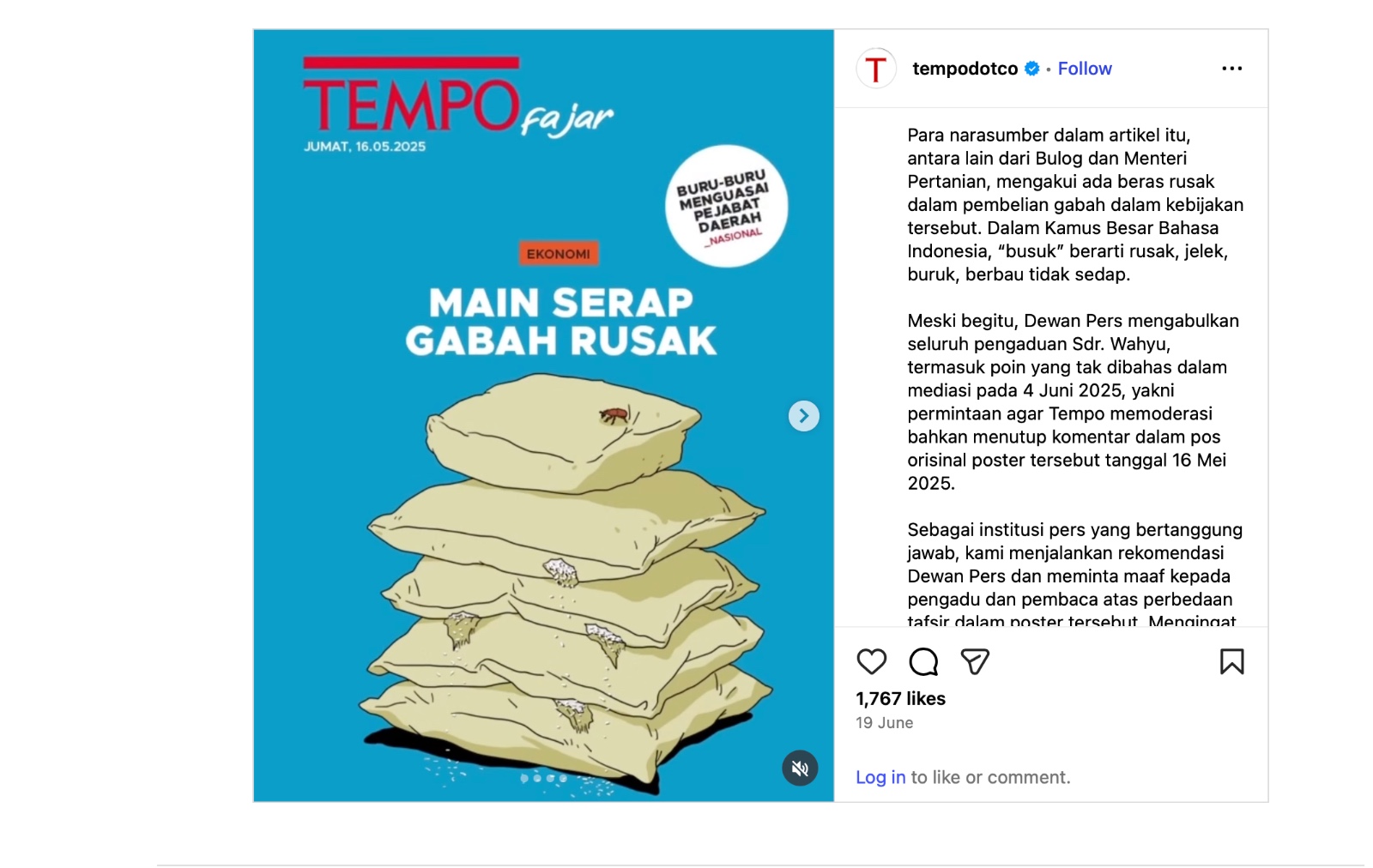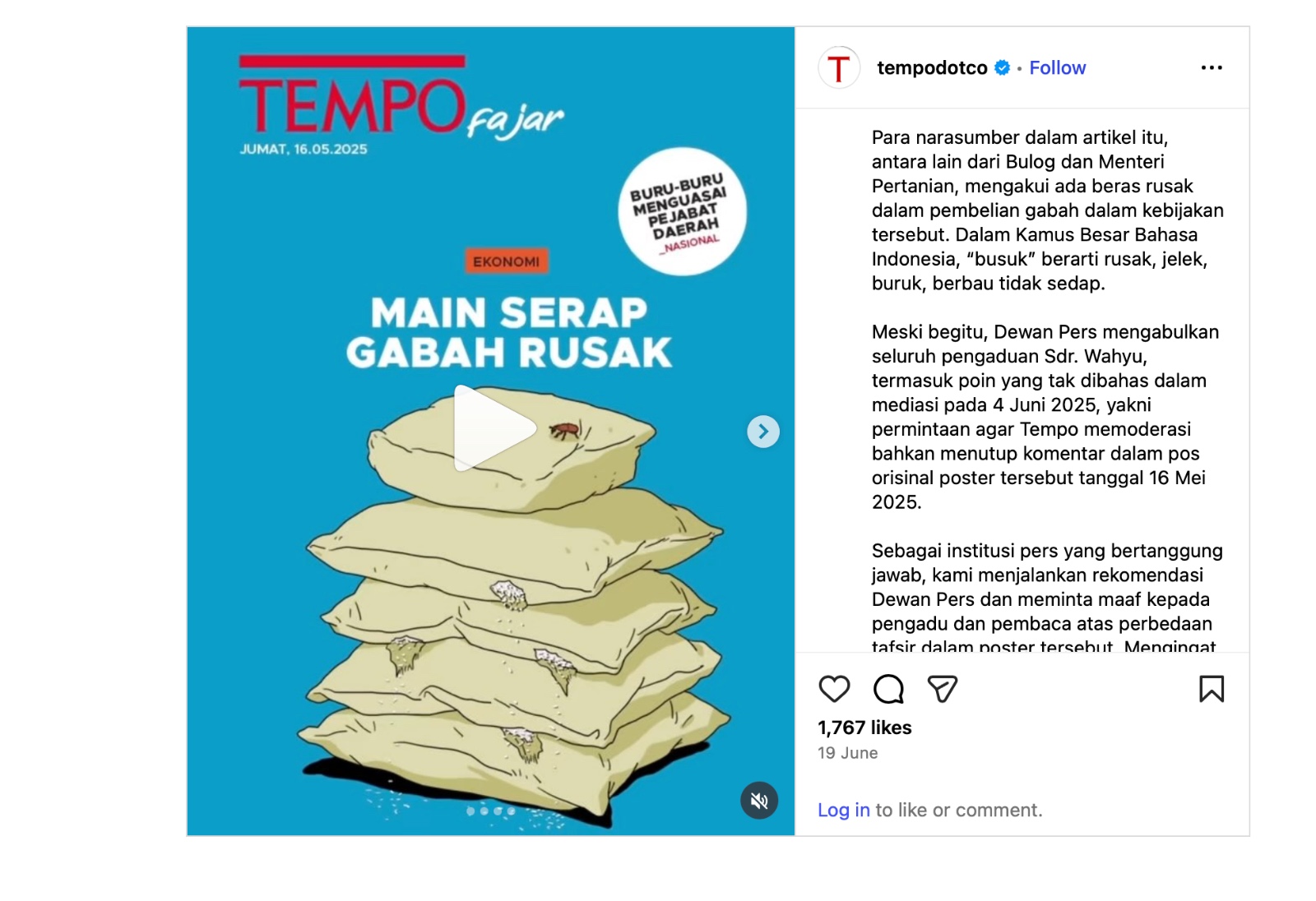 Keterangan gambar: Judul Poster ‘Main Serap Gabah Rusak’ ini diganti sesuai rekomendasi Dewan Pers, dari judul poster sebelumnya ‘Poles-poles Beras Busuk’. Foto: Tangkapan layar sosial media Instagram tempo.co.
