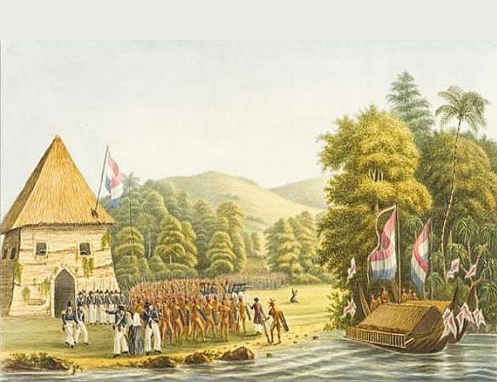Keterangan gambar: Sketsa karya Kapten Kapal Evertsen, QMR Verhuell, Eksekusi Kapitan Paulus Tiahahu di dekat Benteng Beverwijk, Pulau Nusa Laut. (Koleksi Museum Bahari Rotterdam). Sumber foto: sinarharapan.net/penulis