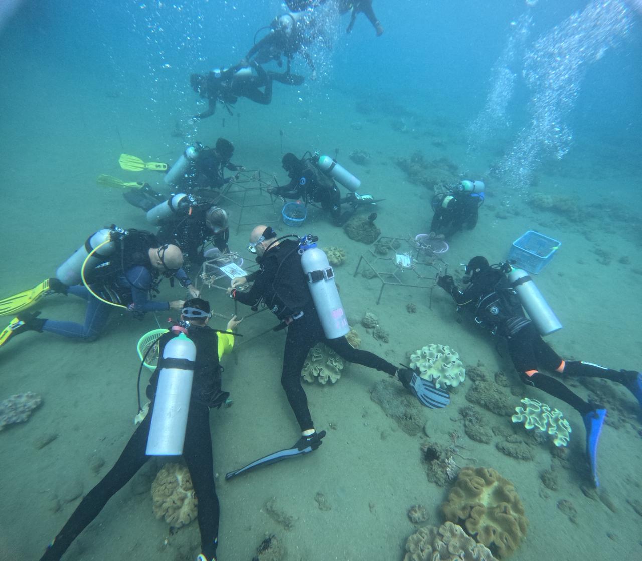 Sebanyak 10 penyelam, termasuk tiga warga negara asing, bekerja di kedalaman sekitar 20 meter dari garis pantai. Mereka memasang struktur buatan sebagai media tumbuh karang baru—sebuah ikhtiar ilmiah yang memerlukan waktu, disiplin, dan pemantauan jangka panjang.