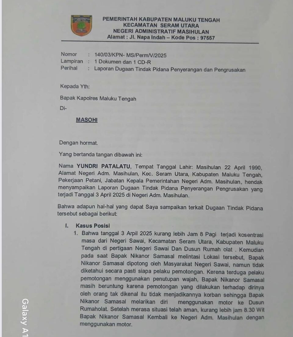 Laporan disampaikan oleh Kepala Pemerintah Negeri Administratif (KPN Adm) Masihulan, Yundri Patalatu, pada Senin, 26 Mei 2025, melalui surat bernomor 140/03/KPN-MS/Perm/V/2025. Dalam laporan itu, Patalatu merinci dugaan tindak pidana penyerangan dan pengrusakan yang dimulai sekitar pukul 08.00 WIT, dipicu oleh insiden percobaan pembacokan terhadap seorang warga bernama Nikanor Samasal.