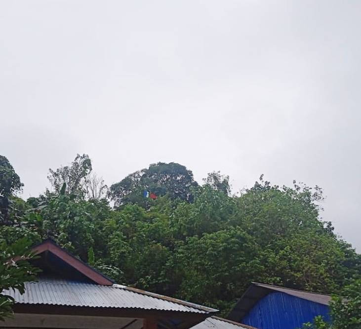 Keterangan gambar: Salah satu bendera dari Kelompok Republik Maluku Selatan (RMS) terlihat berkibar di salah satu pohon di Negeri Aboru, Pulau Haruku. Bendera tersebut dikibarkan bertepatan dengan HUT RI ke-80. Foto: Istimewa