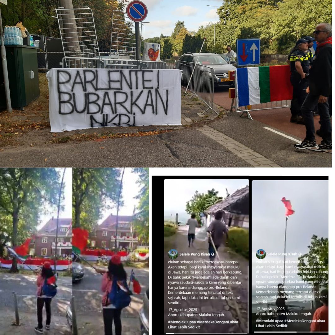 Keesokan harinya, 17 Agustus 2025, protes serupa terjadi di depan Kedutaan Besar RI di Wassenaar, Belanda. Puluhan masyarakat keturunan Maluku membawa bendera RMS dan spanduk bertuliskan “Parlente Bubarkan NKRI” serta seruan menjaga tanah adat dan laut sebagai identitas bangsa Maluku.