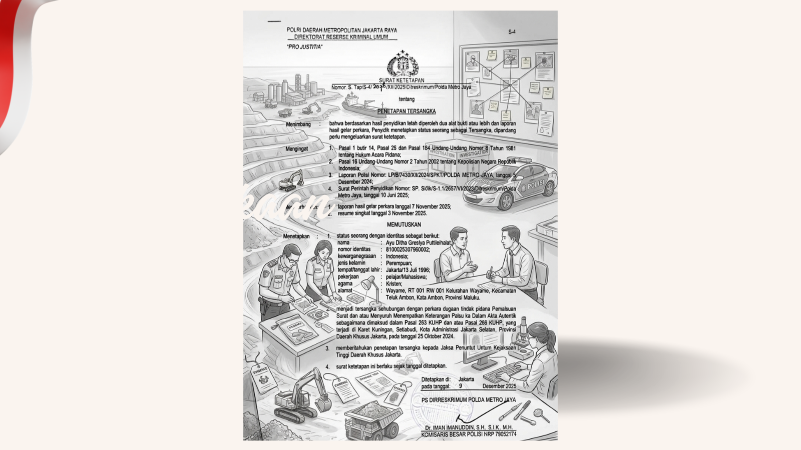 Ayu Ditha ditetapkan sebagai tersangka melalui surat penetapan S.Tap/S 4/2078/XII/2025/Ditreskrimum Polda Metro Jaya tertanggal 9 Desember 2025.