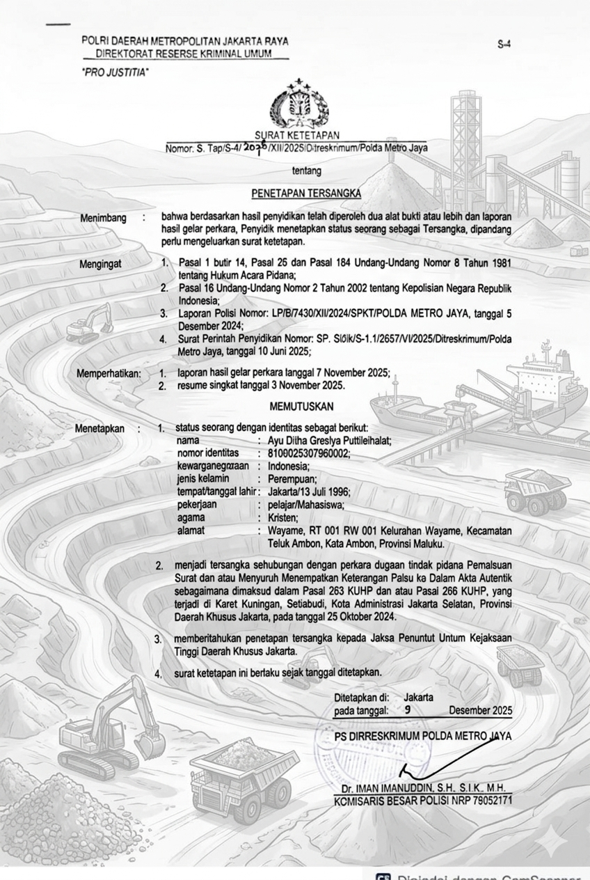 Caption: Dokumen penetapan tersangka atas akta otentik yang diduga Palsu terkait usaha pertambangan di Maluku, Foto: Ist