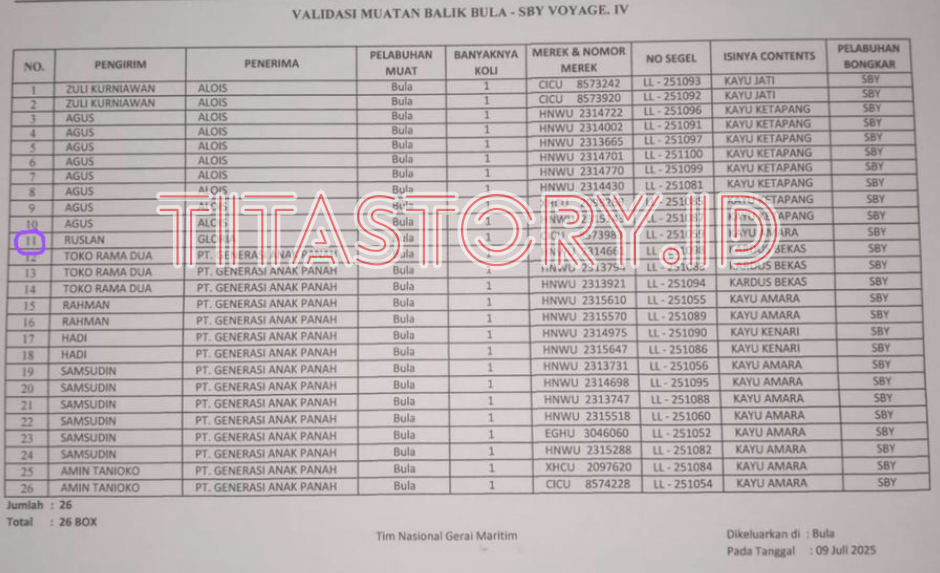 - Kayu dikemas dalam kontainer. Juli 2025, 23 kontainer kayu belu hitam dikirim menggunakan KM Kendaga 12 menuju Surabaya.